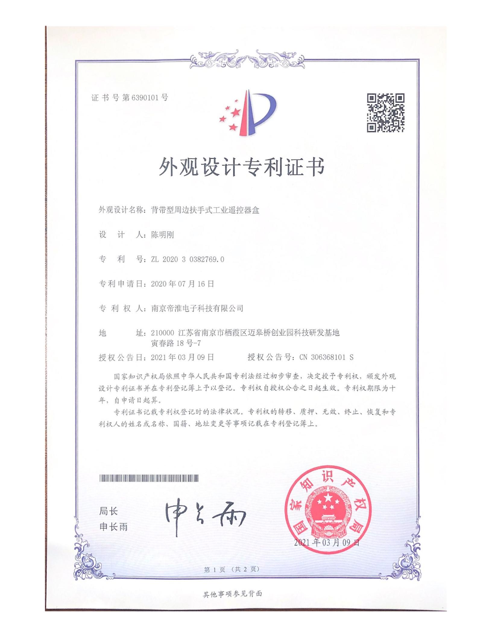 南京帝淮电子科技有限公司,国内工业遥控器行业领军企业,自主研发、定制、非标设计各类工业级无线遥控器、工业级有线控制器、智能化自主算法逻辑的本地控制器等系列产品。已经申请及正在申请的技术专利、外观专利有近三十项左右,并通过了CE欧盟认证、国家级试验检验报告、EMC电磁兼容认证等。